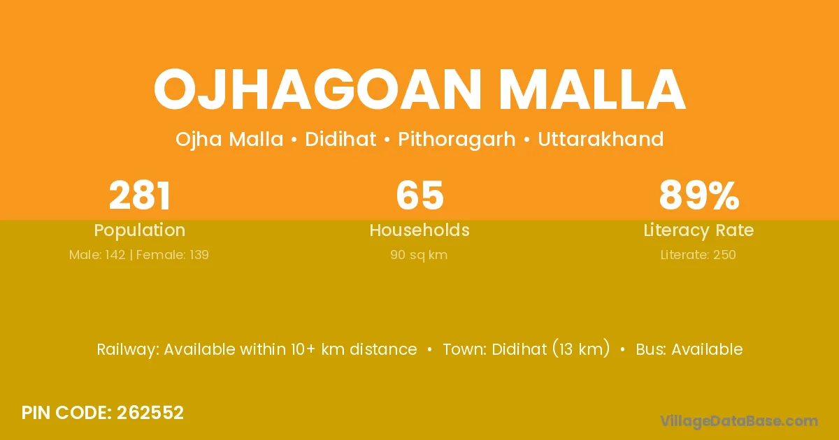 Didihat (13 km) is the nearest town to Ojhagoan Malla village for major economic activities and is located approximately 13 km away.