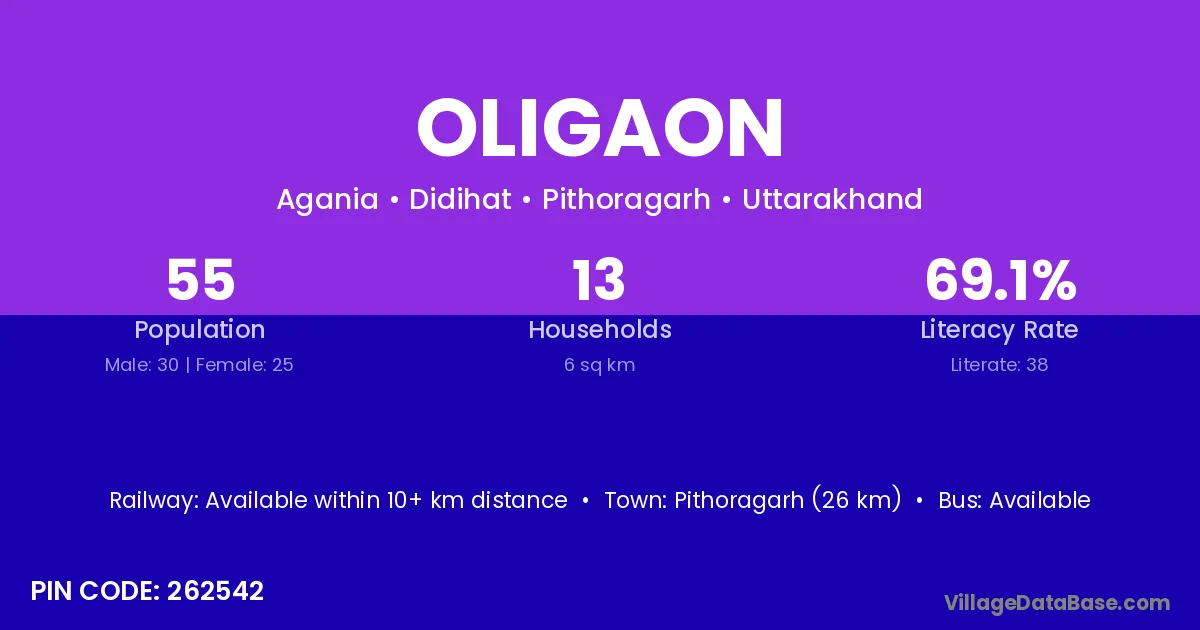 Pithoragarh (26 km) is the nearest town to Oligaon village for major economic activities and is located approximately 26 km away.