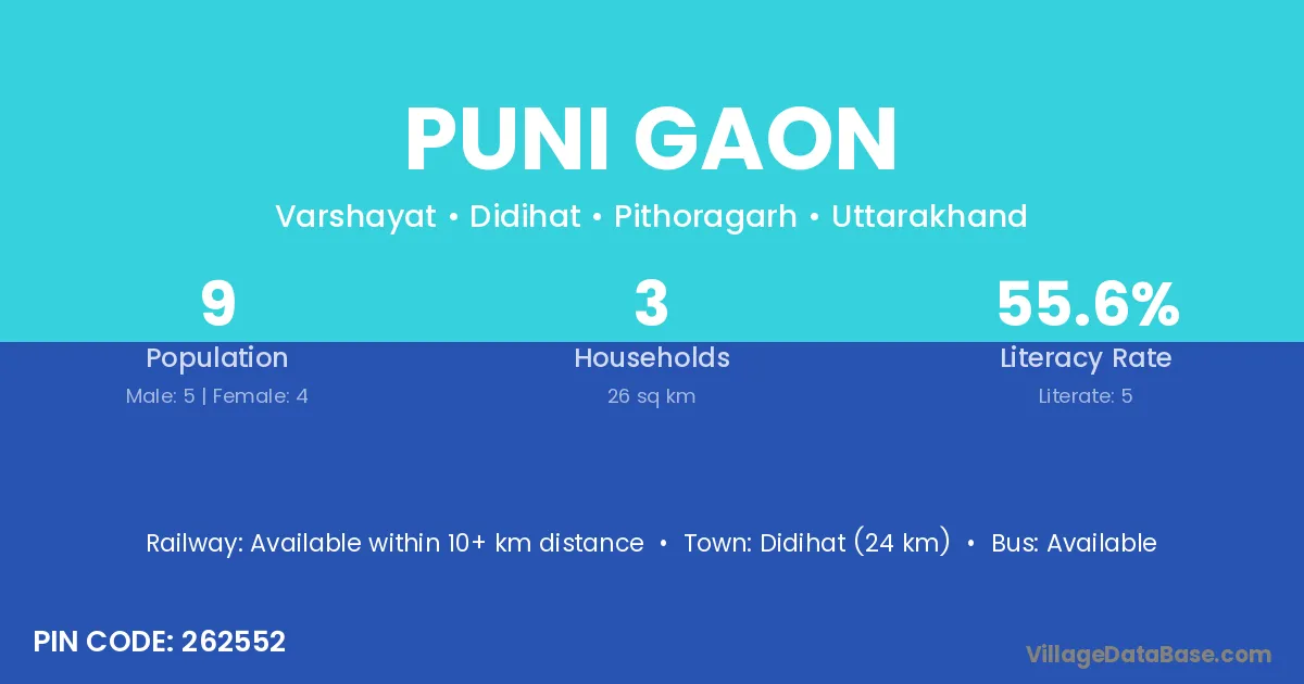Didihat (24 km) is the nearest town to Puni Gaon village for major economic activities and is located approximately 24 km away.