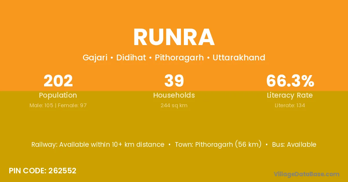 Pithoragarh (56 km) is the nearest town to Runra village for major economic activities and is located approximately 56 km away.