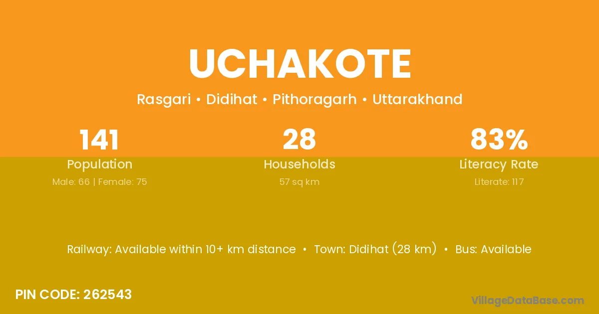 Didihat (28 km) is the nearest town to Uchakote village for major economic activities and is located approximately 28 km away.