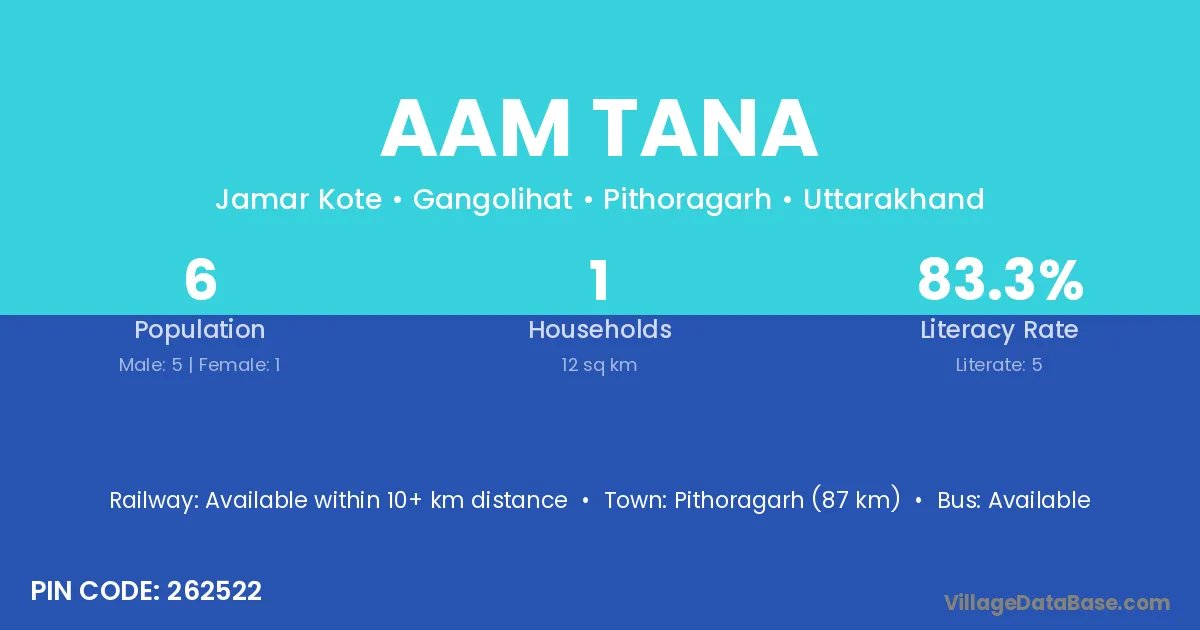 Pithoragarh (87 km) is the nearest town to Aam Tana village for major economic activities and is located approximately 87 km away.