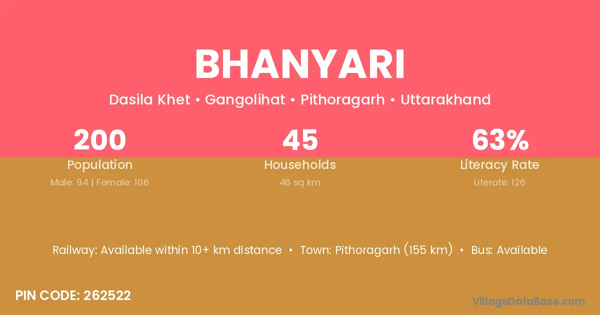 Pithoragarh (155 km) is the nearest town to Bhanyari village for major economic activities and is located approximately 155 km away.