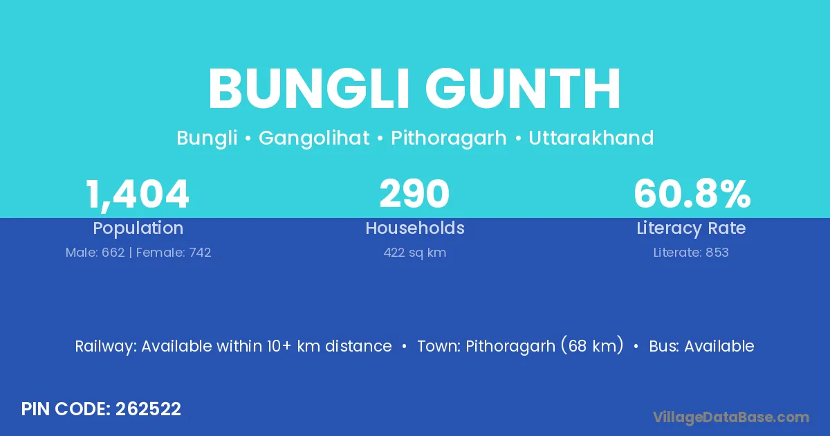 Pithoragarh (68 km) is the nearest town to Bungli Gunth village for major economic activities and is located approximately 68 km away.