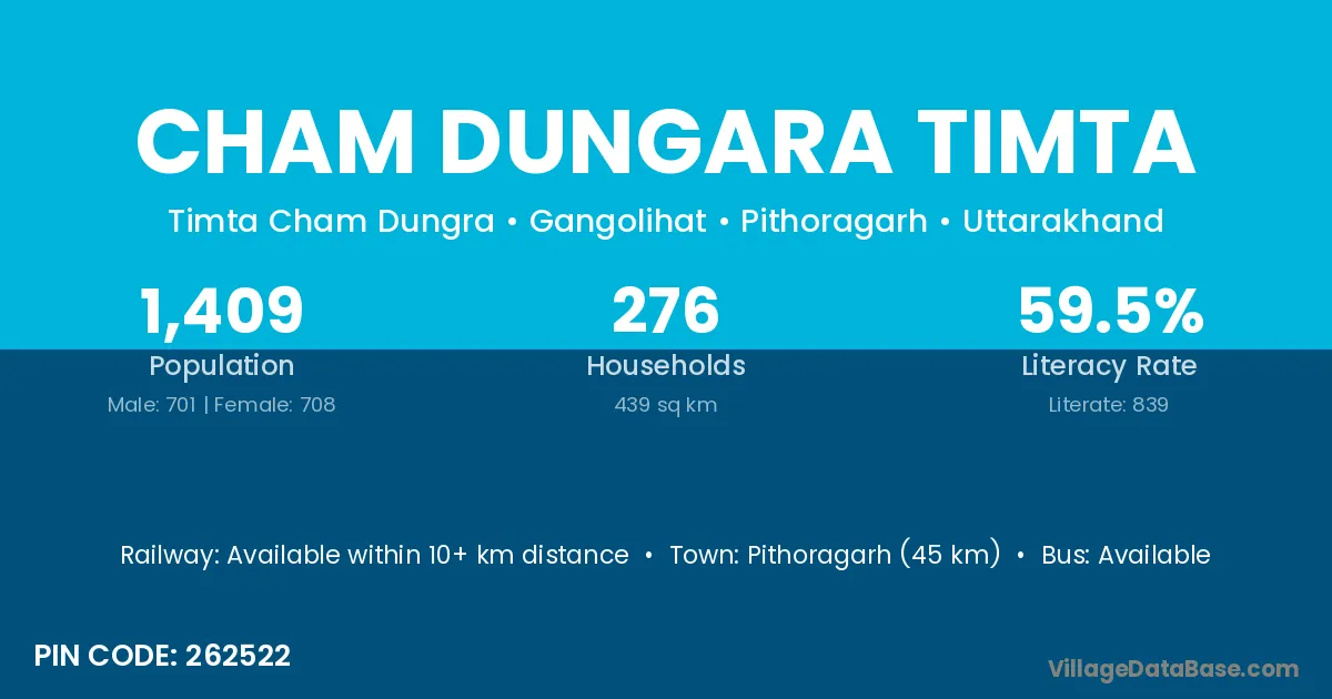 Pithoragarh (45 km) is the nearest town to Cham Dungara Timta village for major economic activities and is located approximately 45 km away.