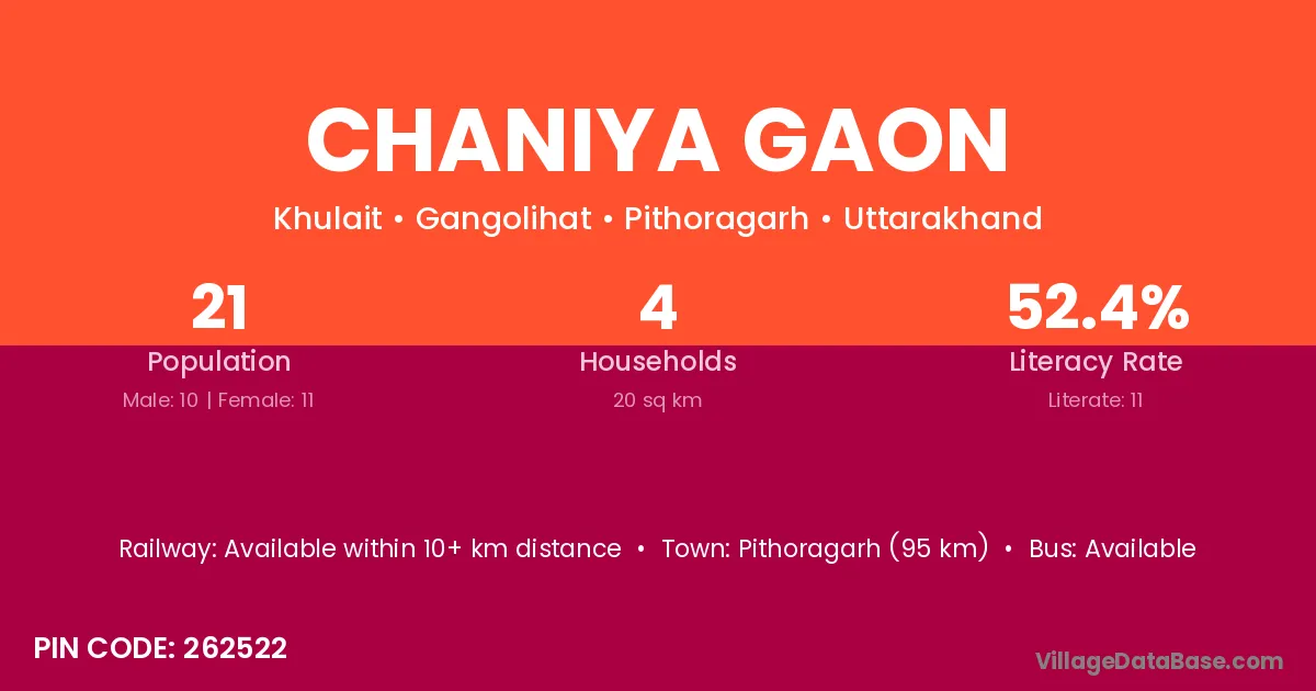 Chaniya Gaon village has a total population of 21 people, of which 10 are males and 11 are females.