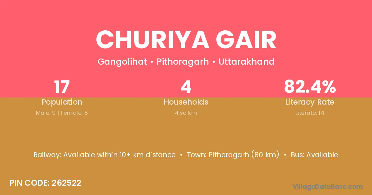 Pithoragarh (80 km) is the nearest town to Churiya Gair village for major economic activities and is located approximately 80 km away.