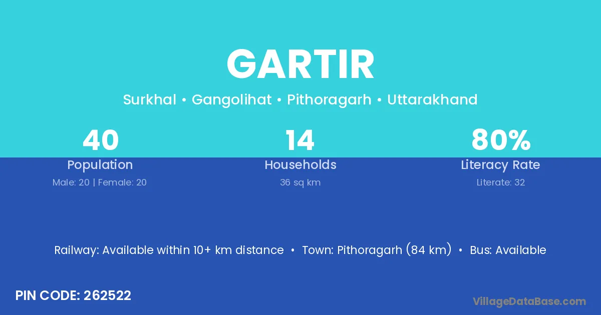 Pithoragarh (84 km) is the nearest town to Gartir village for major economic activities and is located approximately 84 km away.