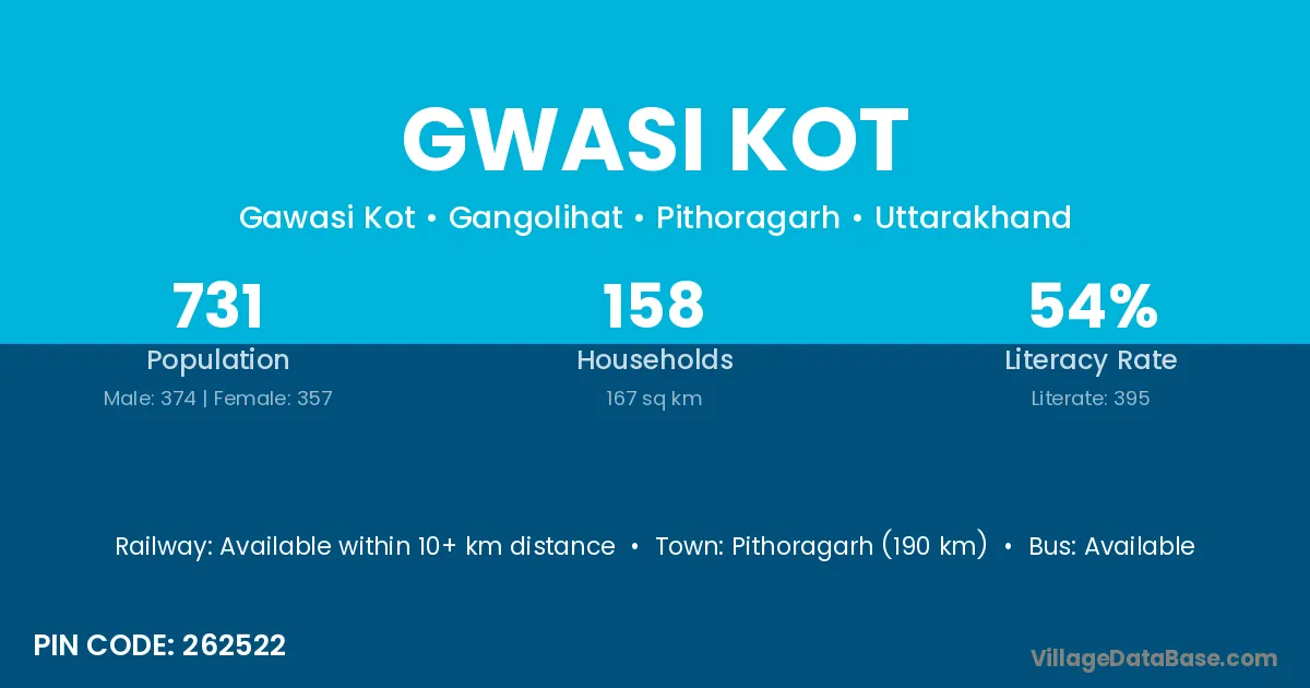 Pithoragarh (190 km) is the nearest town to Gwasi Kot village for major economic activities and is located approximately 190 km away.