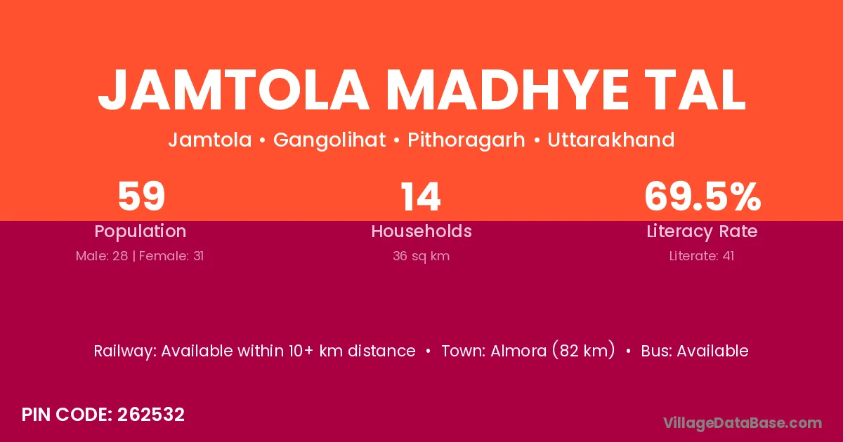 Almora (82 km) is the nearest town to Jamtola Madhye Tal village for major economic activities and is located approximately 82 km away.