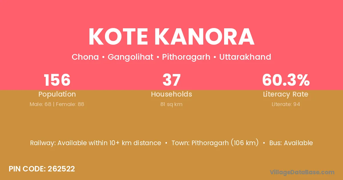 Pithoragarh (106 km) is the nearest town to Kote Kanora village for major economic activities and is located approximately 106 km away.