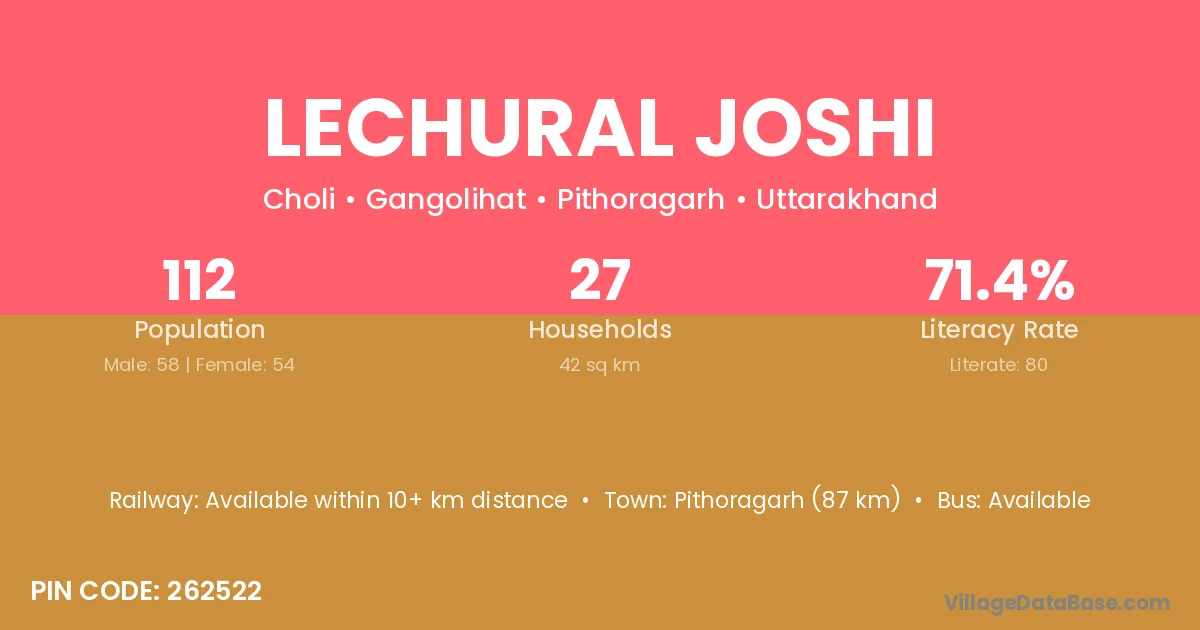 Pithoragarh (87 km) is the nearest town to Lechural Joshi village for major economic activities and is located approximately 87 km away.