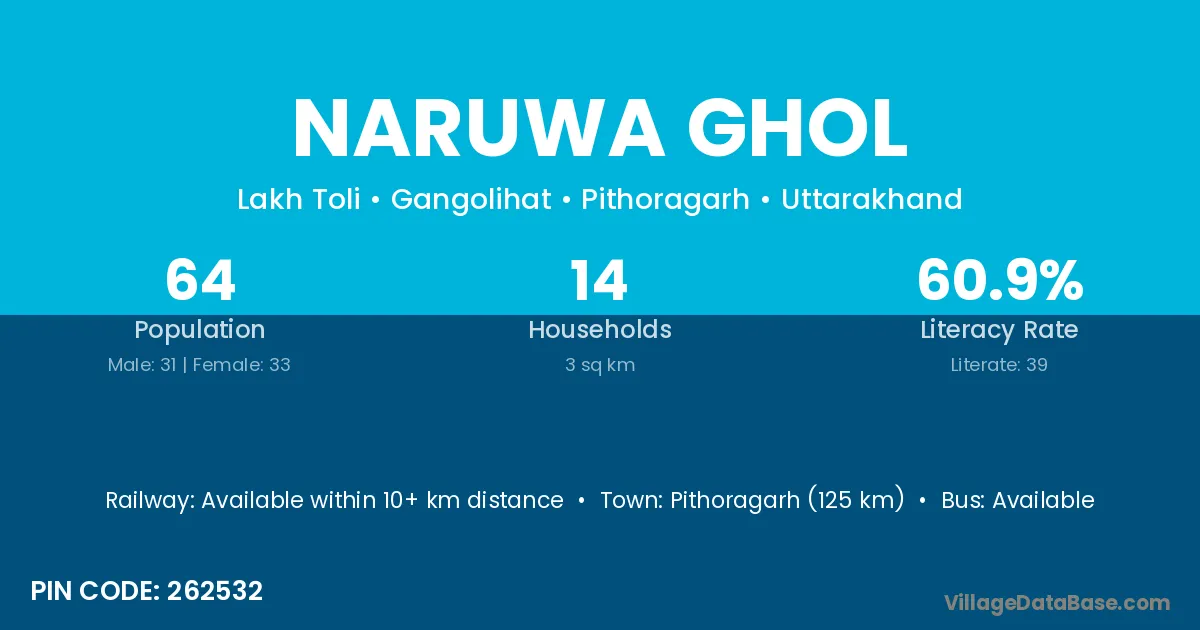 Pithoragarh (125 km) is the nearest town to Naruwa Ghol village for major economic activities and is located approximately 125 km away.