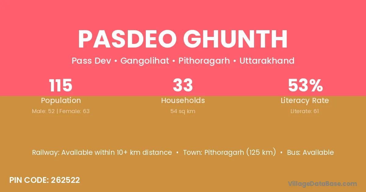 Pithoragarh (125 km) is the nearest town to Pasdeo Ghunth village for major economic activities and is located approximately 125 km away.