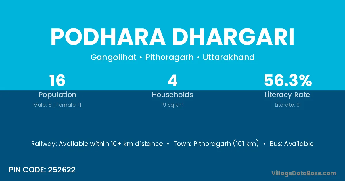Pithoragarh (101 km) is the nearest town to Podhara Dhargari village for major economic activities and is located approximately 101 km away.