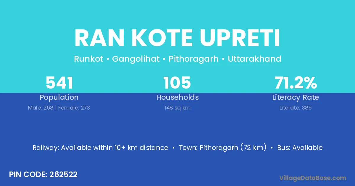 Ran Kote Upreti village has a total population of 541 people, of which 268 are males and 273 are females.