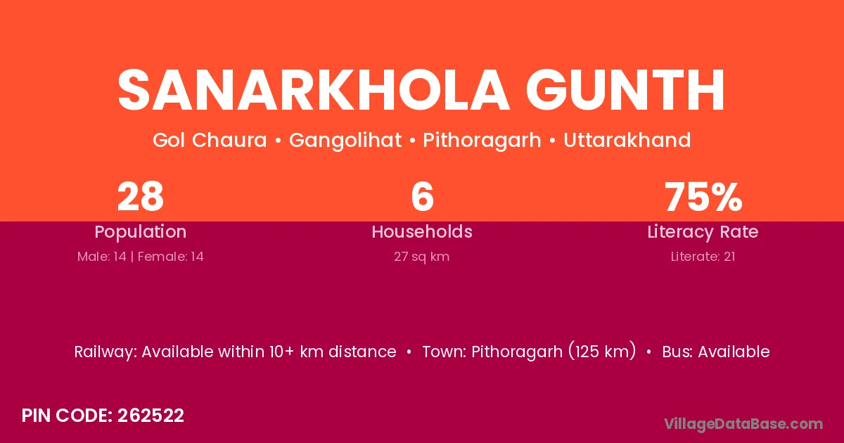 Pithoragarh (125 km) is the nearest town to Sanarkhola Gunth village for major economic activities and is located approximately 125 km away.