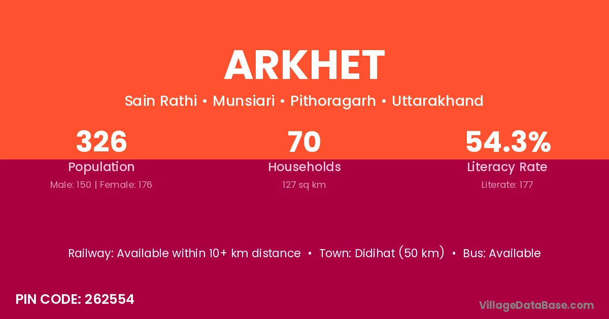 Didihat (50 km) is the nearest town to Arkhet village for major economic activities and is located approximately 50 km away.