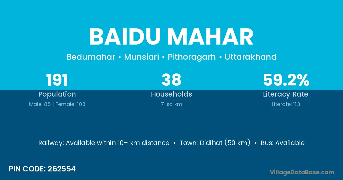 Didihat (50 km) is the nearest town to Baidu Mahar village for major economic activities and is located approximately 50 km away.