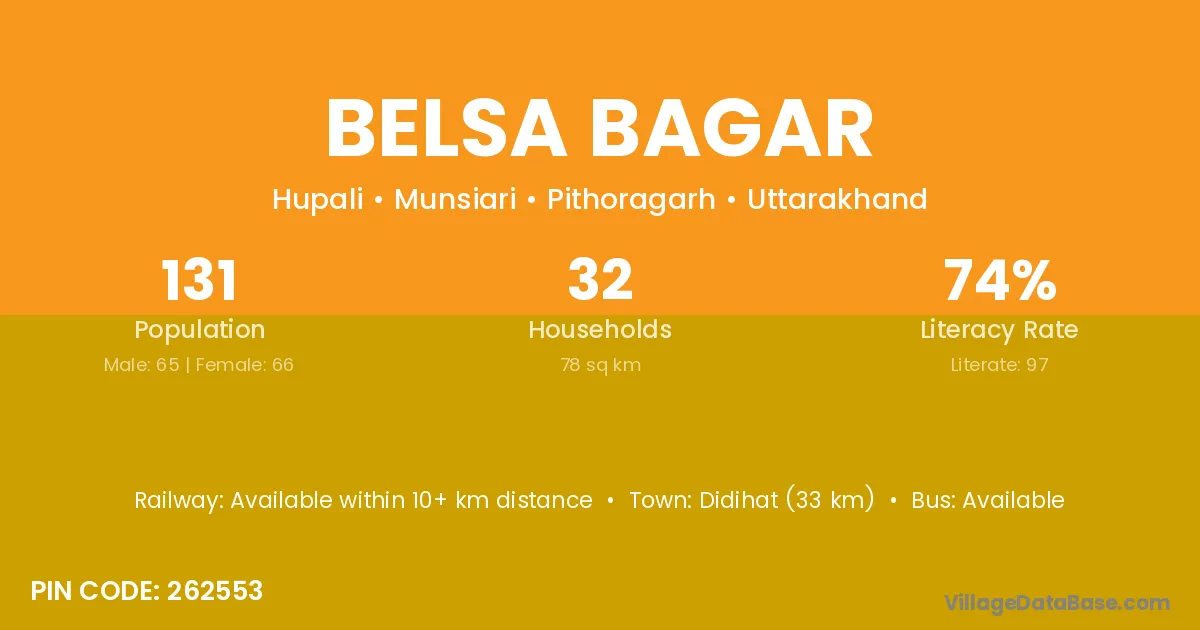 Didihat (33 km) is the nearest town to Belsa Bagar village for major economic activities and is located approximately 33 km away.