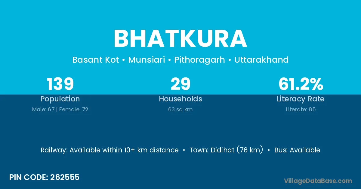 Didihat (76 km) is the nearest town to Bhatkura village for major economic activities and is located approximately 76 km away.