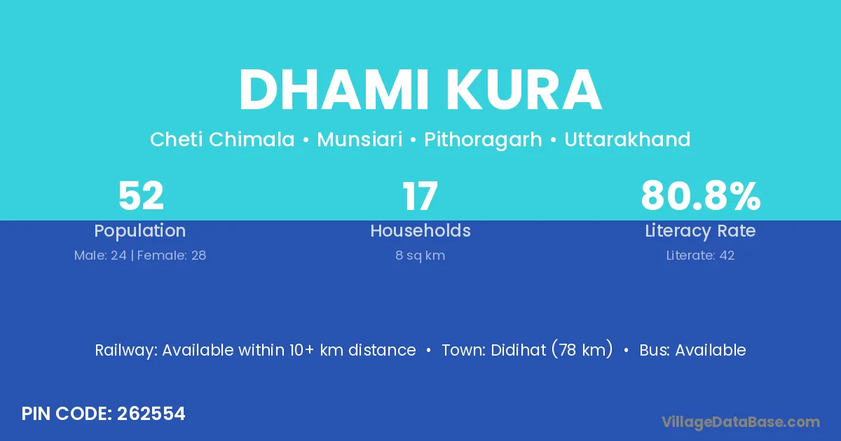 Didihat (78 km) is the nearest town to Dhami Kura village for major economic activities and is located approximately 78 km away.