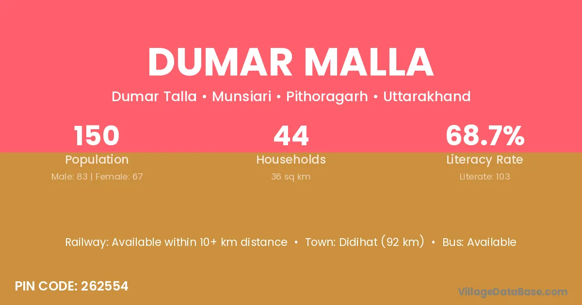 Didihat (92 km) is the nearest town to Dumar Malla village for major economic activities and is located approximately 92 km away.