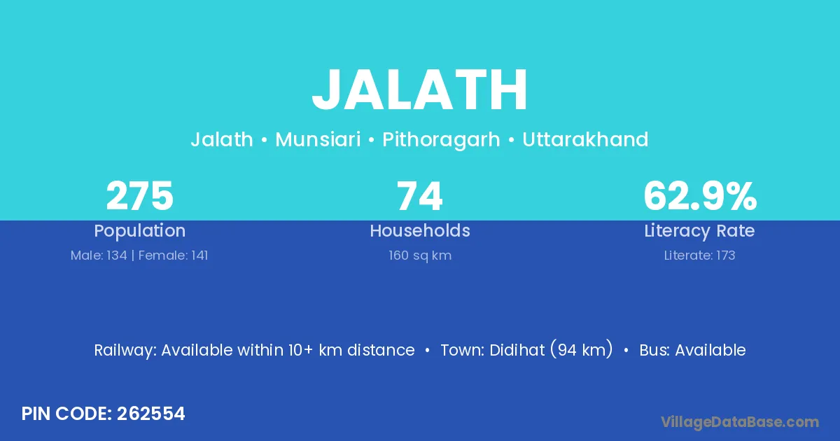 Didihat (94 km) is the nearest town to Jalath village for major economic activities and is located approximately 94 km away.