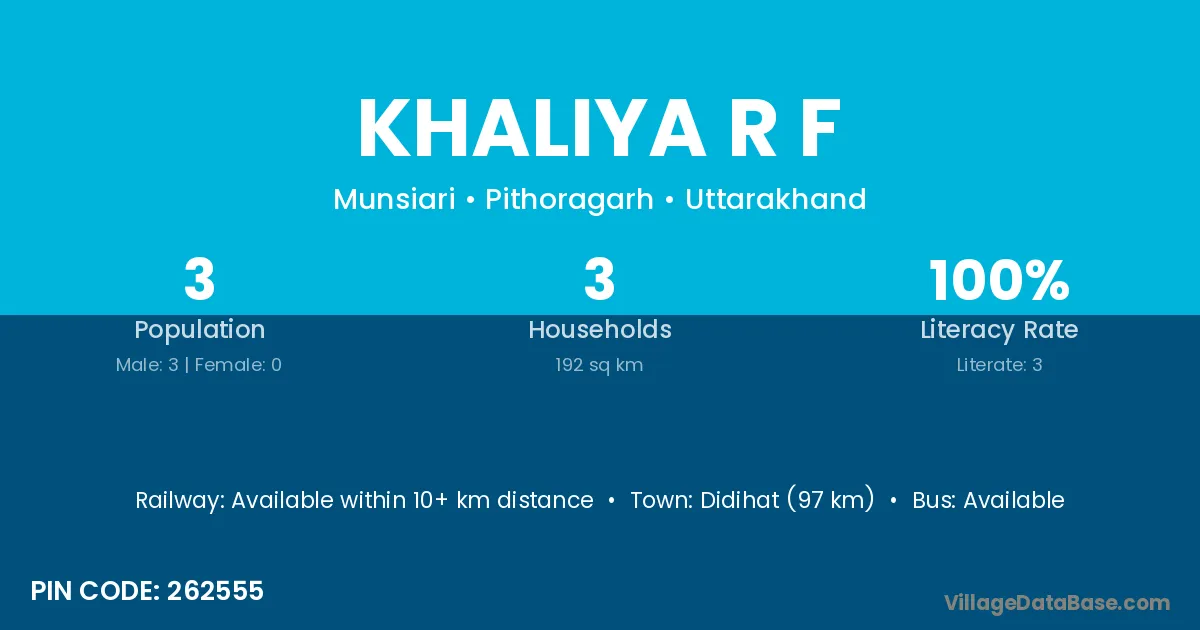 Didihat (97 km) is the nearest town to Khaliya R F village for major economic activities and is located approximately 97 km away.