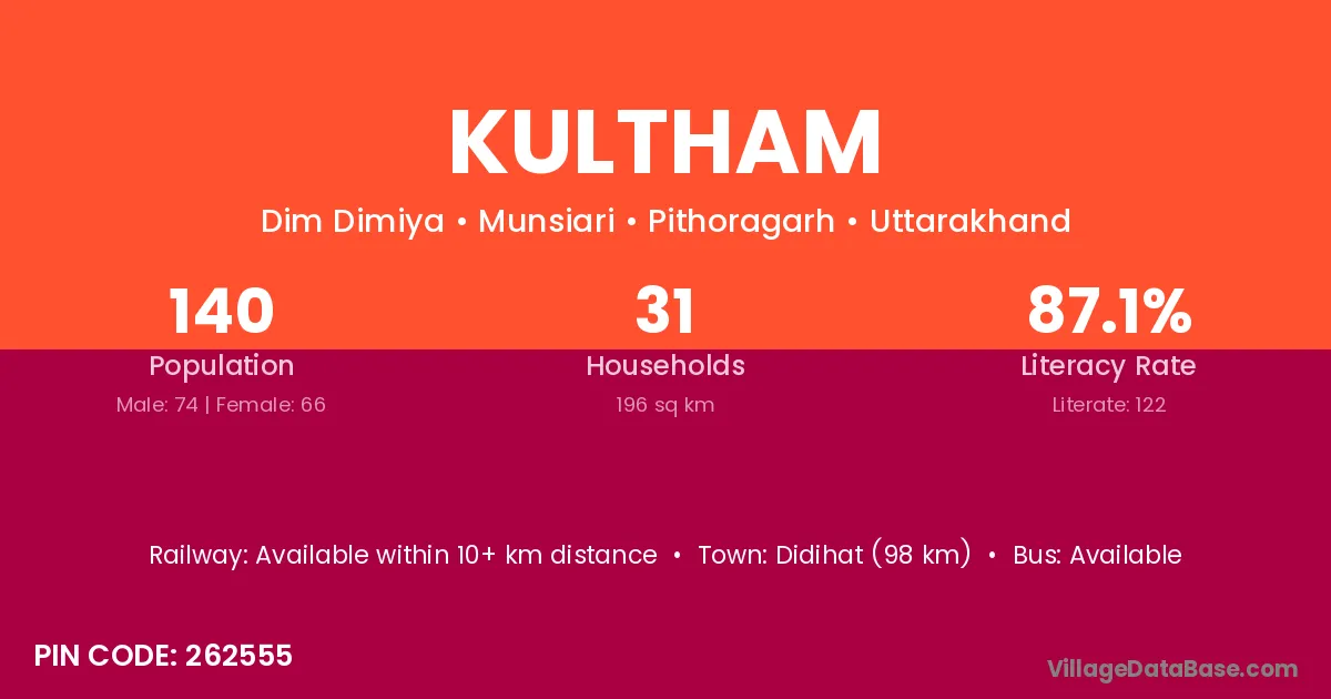 Didihat (98 km) is the nearest town to Kultham village for major economic activities and is located approximately 98 km away.