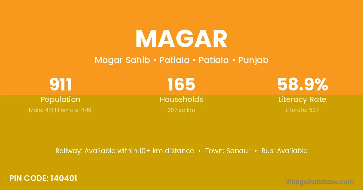The literacy rate of Magar village is 60.89%. Male literacy stands at 69.40% and female literacy at 52.55%.