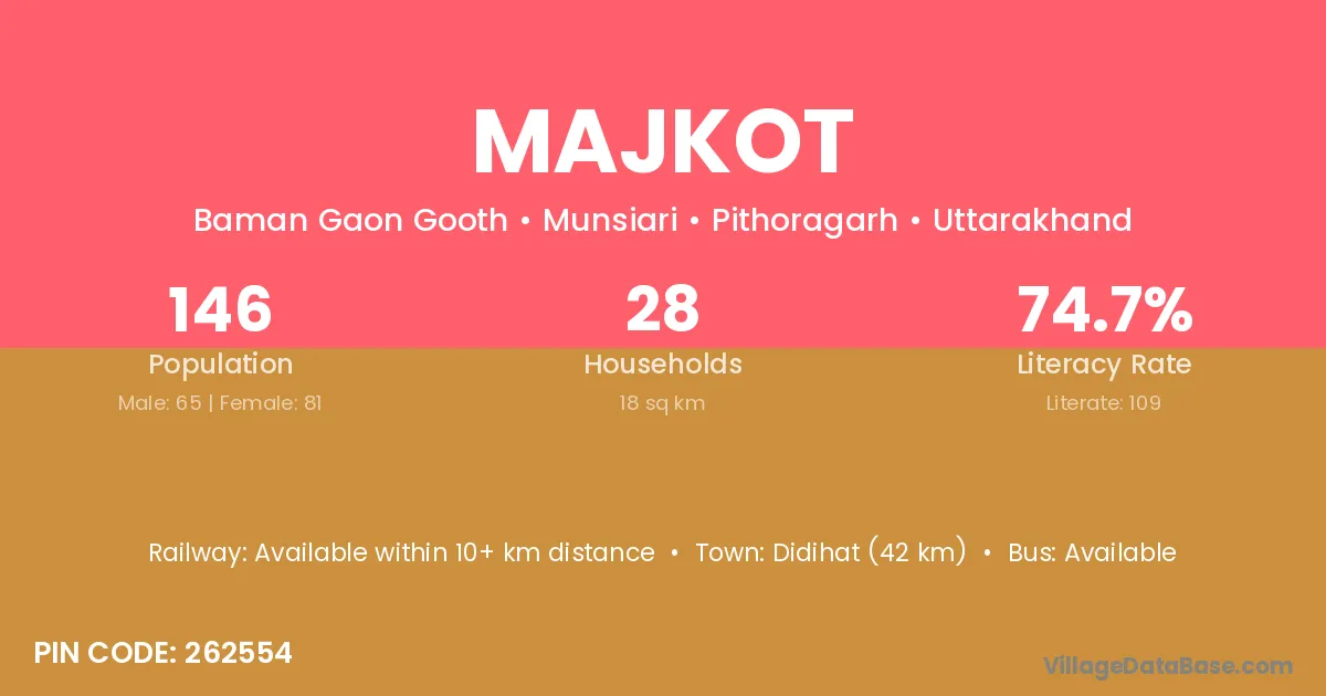 Didihat (42 km) is the nearest town to Majkot village for major economic activities and is located approximately 42 km away.