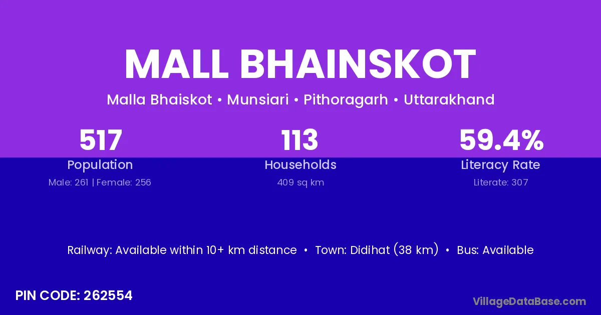 Didihat (38 km) is the nearest town to Mall Bhainskot village for major economic activities and is located approximately 38 km away.