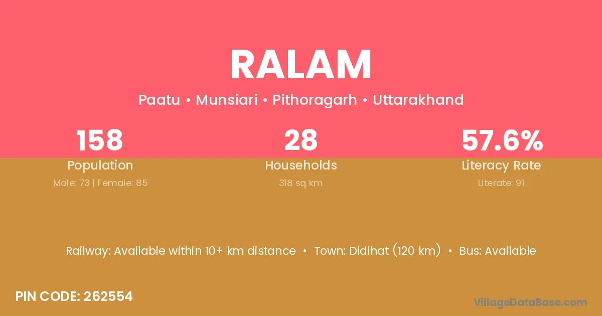Didihat (120 km) is the nearest town to Ralam village for major economic activities and is located approximately 120 km away.