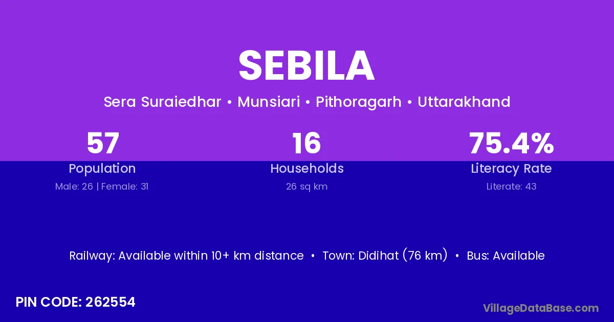 Didihat (76 km) is the nearest town to Sebila village for major economic activities and is located approximately 76 km away.