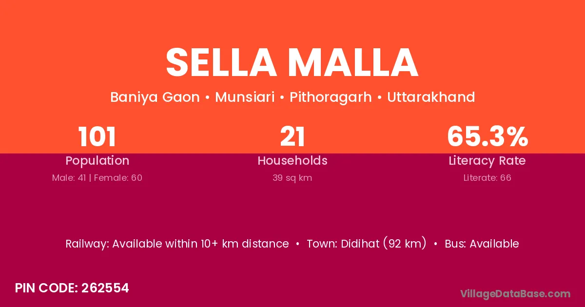 Didihat (92 km) is the nearest town to Sella Malla village for major economic activities and is located approximately 92 km away.