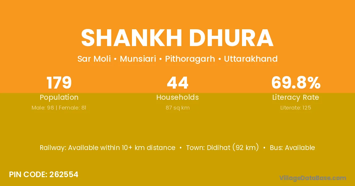 Didihat (92 km) is the nearest town to Shankh Dhura village for major economic activities and is located approximately 92 km away.