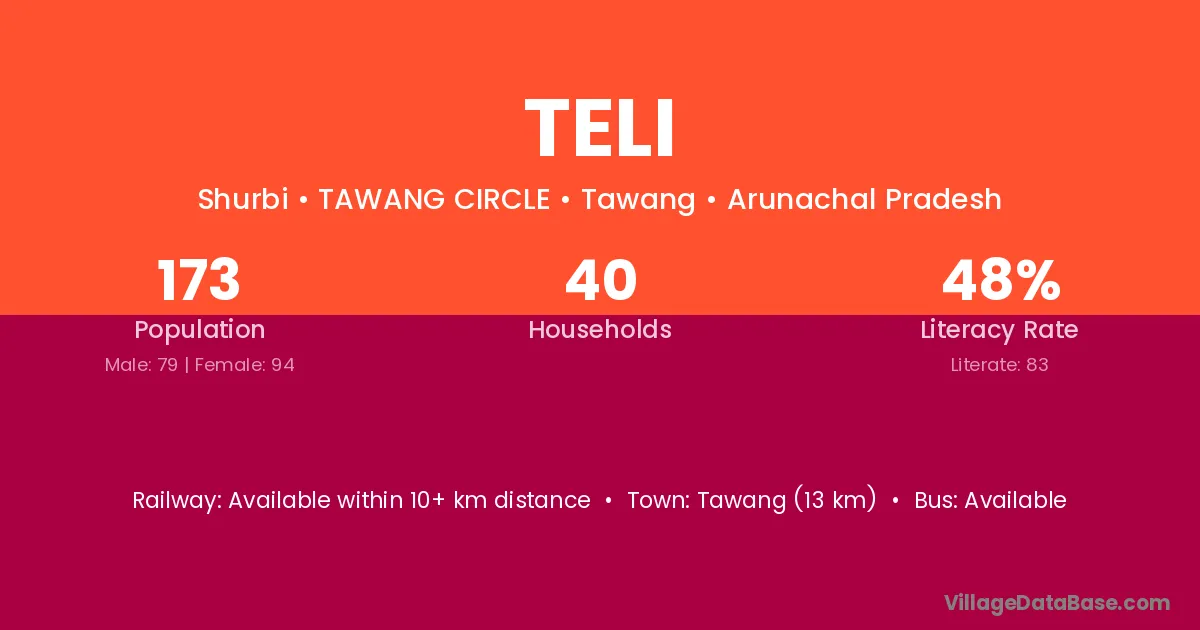 The literacy rate of Teli village is 69.57%. Male literacy stands at 81.82% and female literacy at 58.33%.
