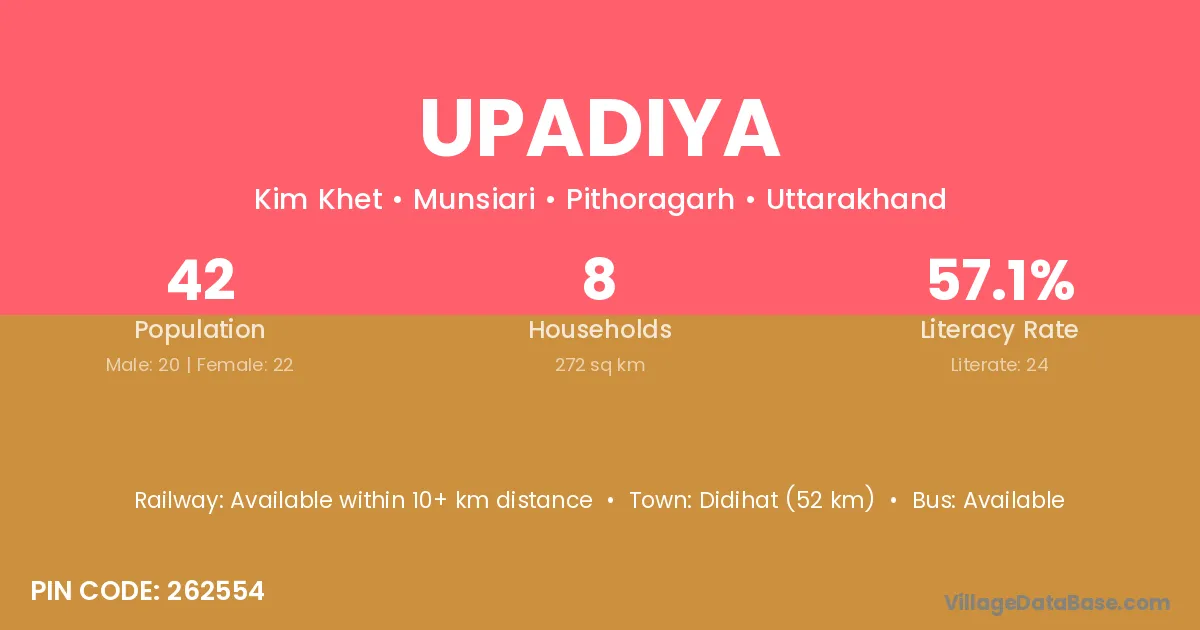 Didihat (52 km) is the nearest town to Upadiya village for major economic activities and is located approximately 52 km away.