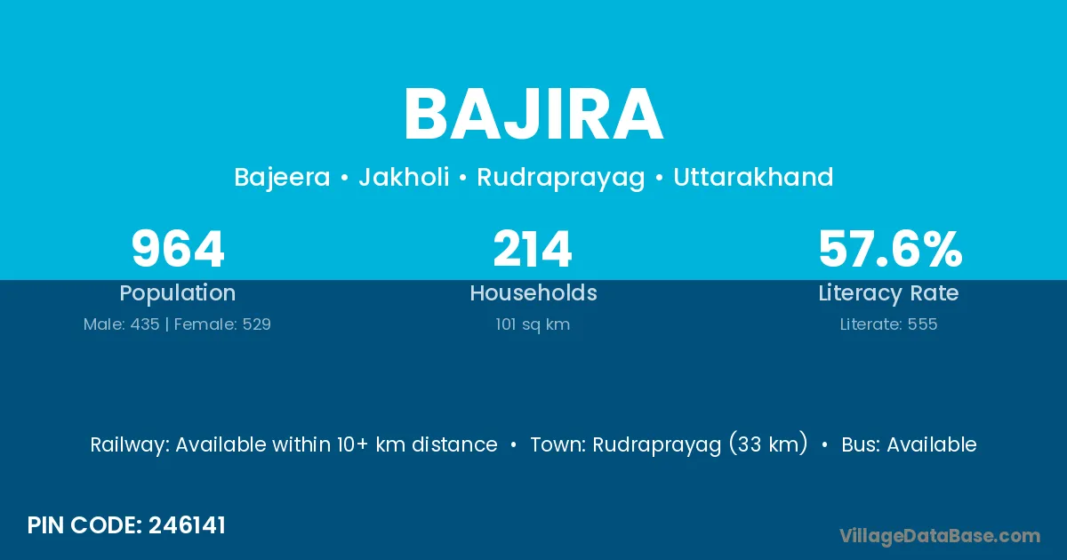 Rudraprayag (33 km) is the nearest town to Bajira village for major economic activities and is located approximately 33 km away.
