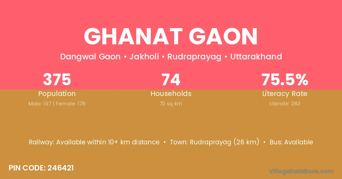 Rudraprayag (26 km) is the nearest town to Ghanat Gaon village for major economic activities and is located approximately 26 km away.
