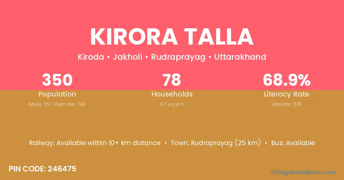 Rudraprayag (25 km) is the nearest town to Kirora Talla village for major economic activities and is located approximately 25 km away.