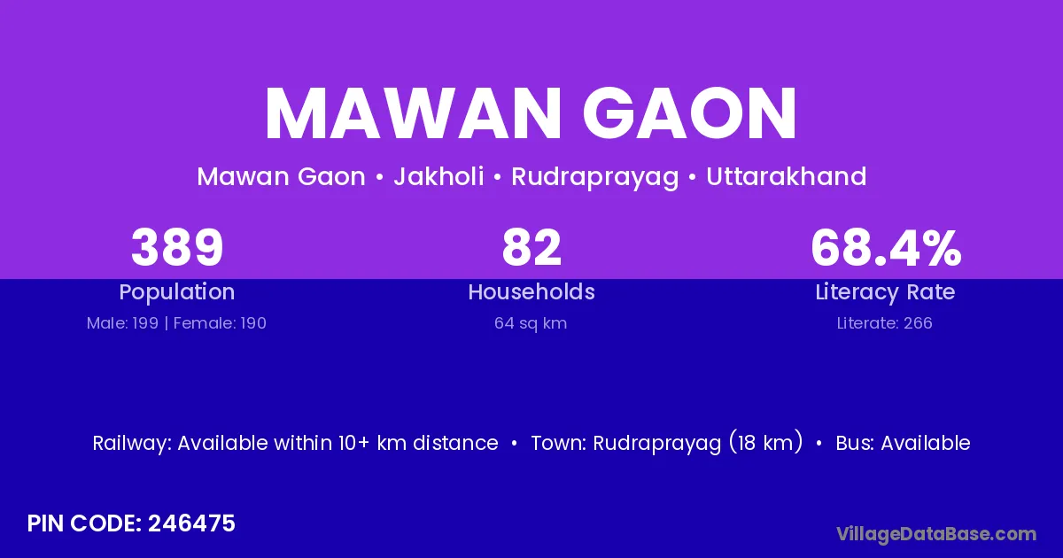 Rudraprayag (18 km) is the nearest town to Mawan Gaon village for major economic activities and is located approximately 18 km away.