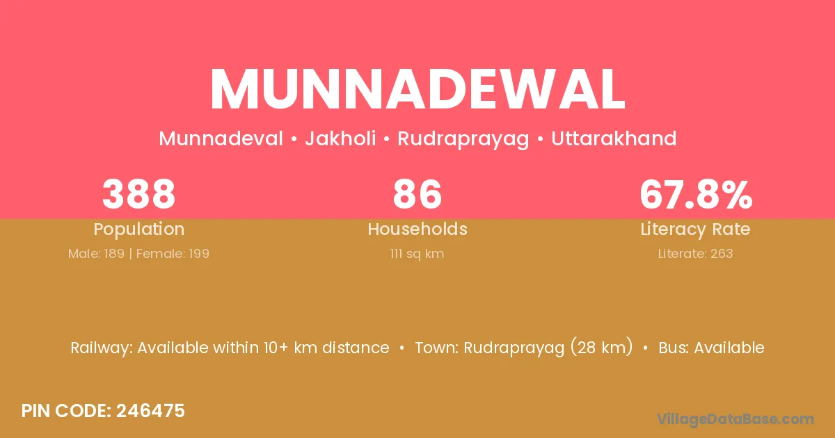 Rudraprayag (28 km) is the nearest town to Munnadewal village for major economic activities and is located approximately 28 km away.