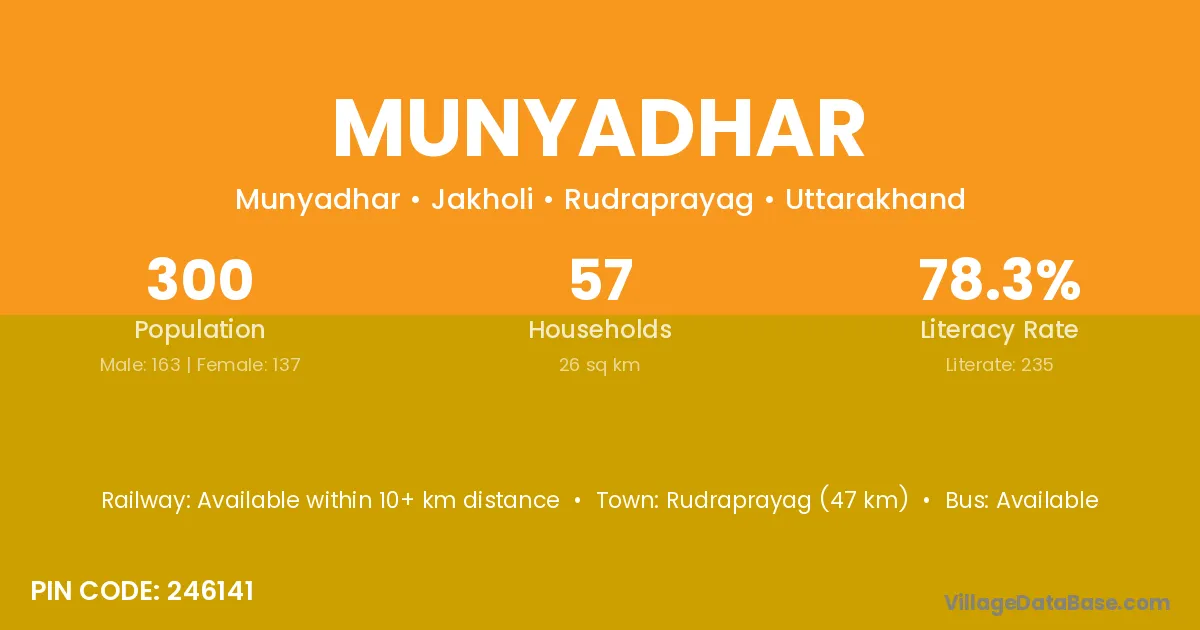 Rudraprayag (47 km) is the nearest town to Munyadhar village for major economic activities and is located approximately 47 km away.