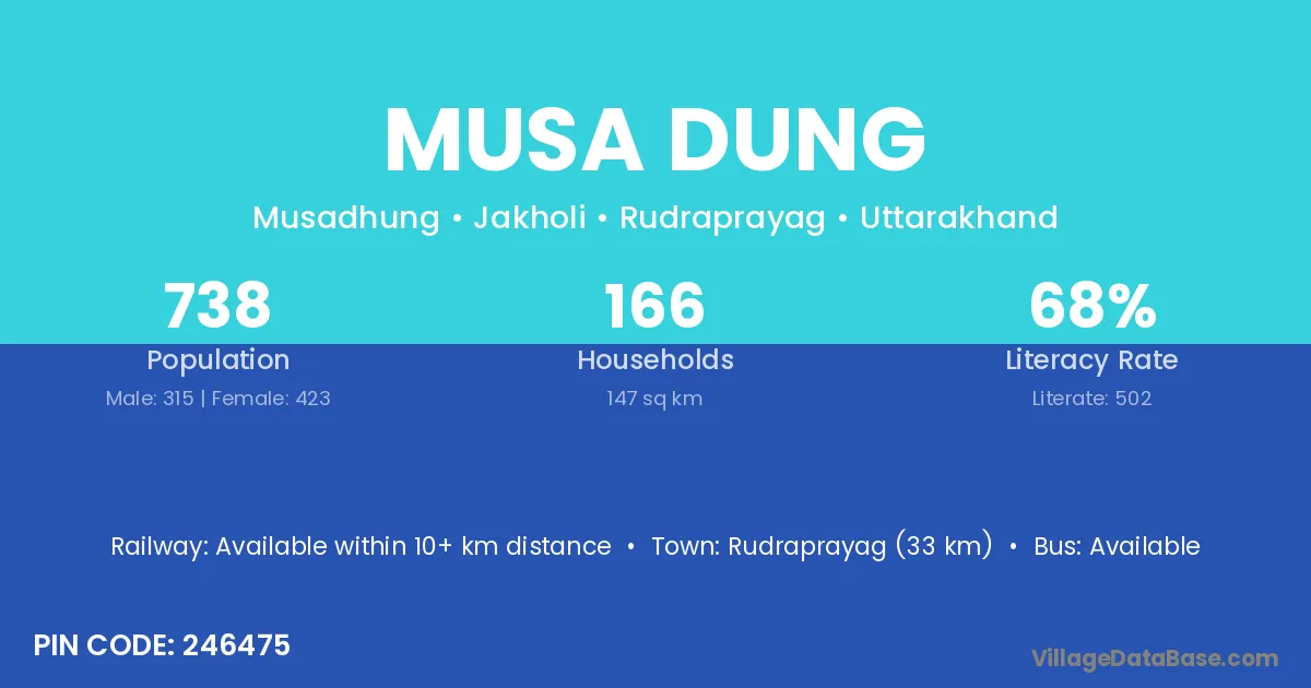 Rudraprayag (33 km) is the nearest town to Musa Dung village for major economic activities and is located approximately 33 km away.