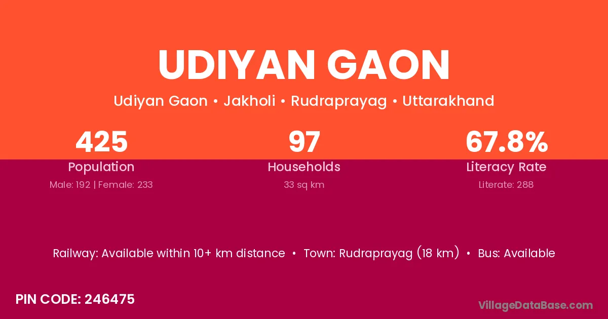 Rudraprayag (18 km) is the nearest town to Udiyan Gaon village for major economic activities and is located approximately 18 km away.
