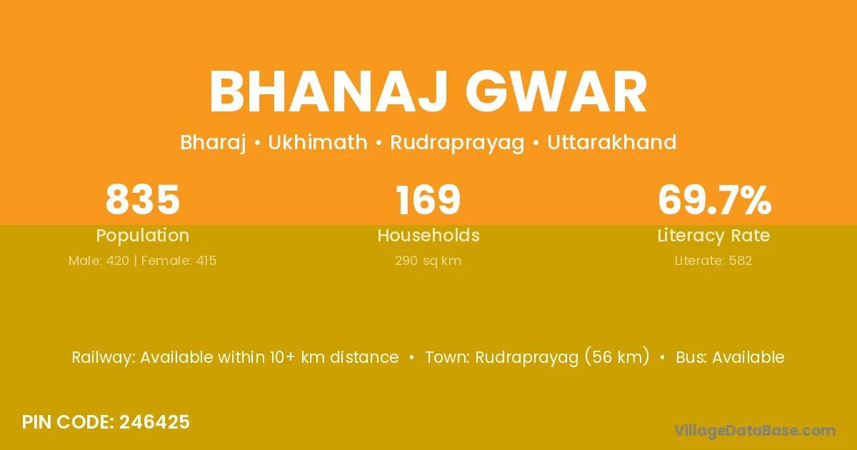 Rudraprayag (56 km) is the nearest town to Bhanaj Gwar village for major economic activities and is located approximately 56 km away.