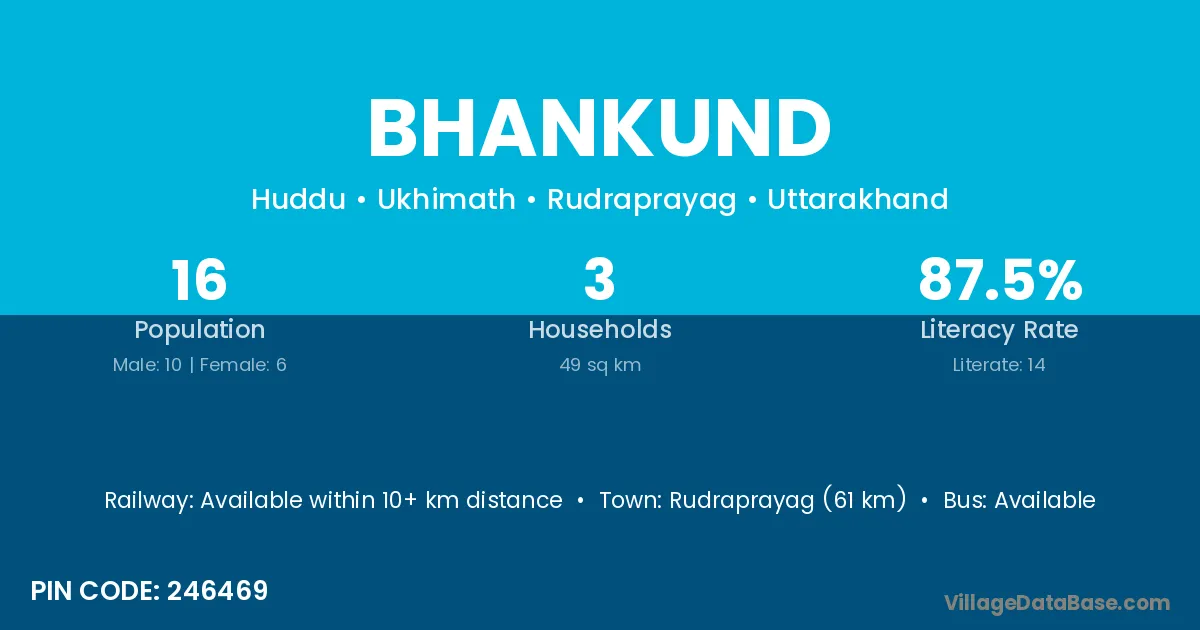 Rudraprayag (61 km) is the nearest town to Bhankund village for major economic activities and is located approximately 61 km away.