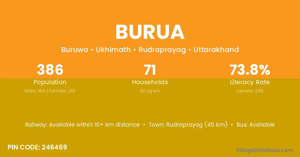 Rudraprayag (45 km) is the nearest town to Burua village for major economic activities and is located approximately 45 km away.
